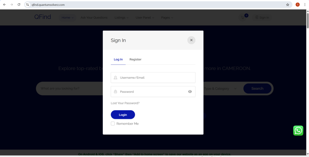 3. If you already have a user account, fill in your username/email and password and login. If you have never created an account on QFind, go to the next step below and click on Register.