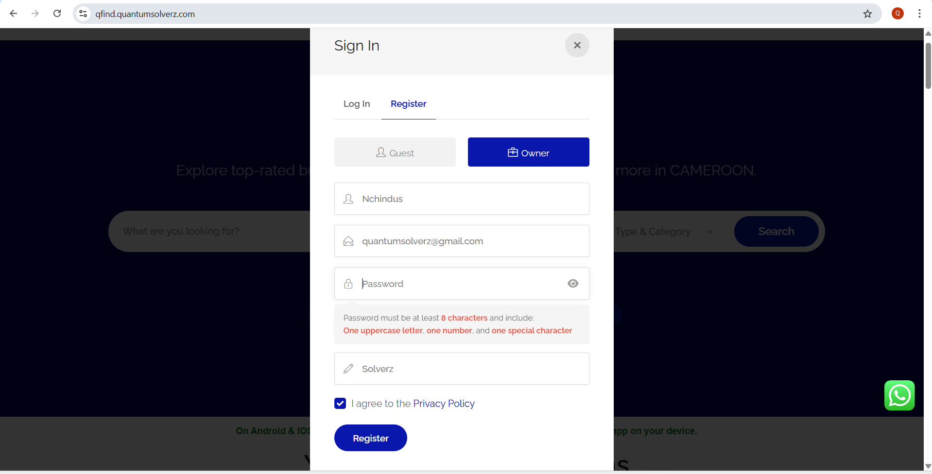 4. If you do not have a user account on QFind, create one by clicking on Register then fill in the form with your required details. Click on Register at the end of the form.