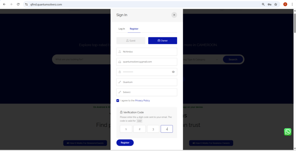 5. A verification code will be sent to your email address. Fill in the code and click Register. You will be logged in automatically.